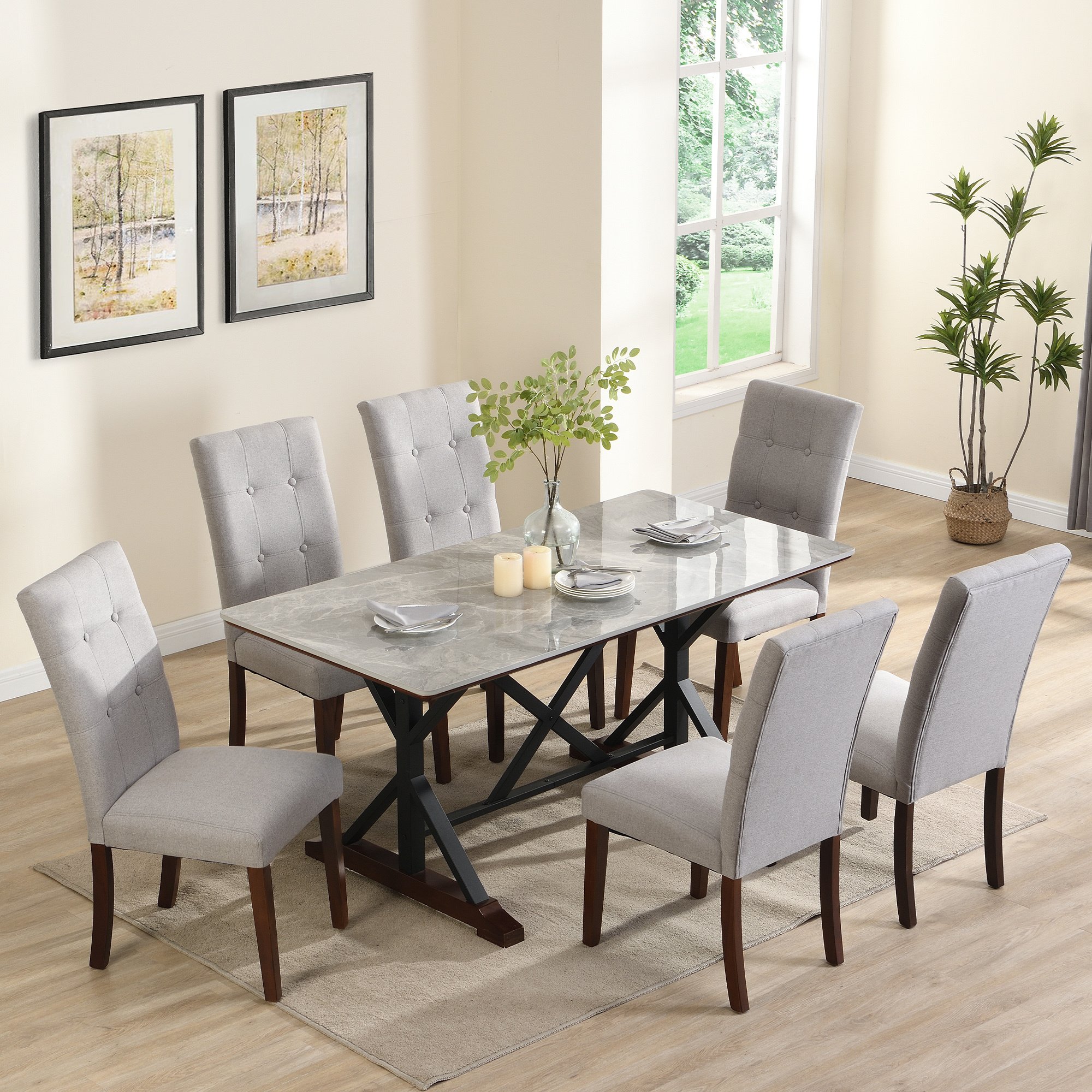 1.7-Piece Dining Sets This classic style dining table set includes a marbling sintered stone rectangle table, and 6 upholstered skin-friendly linen chairs. This dining table set allows all family members to sit together and enjoy vittles and beverages and the warm and harmonious atmosphere of the family.