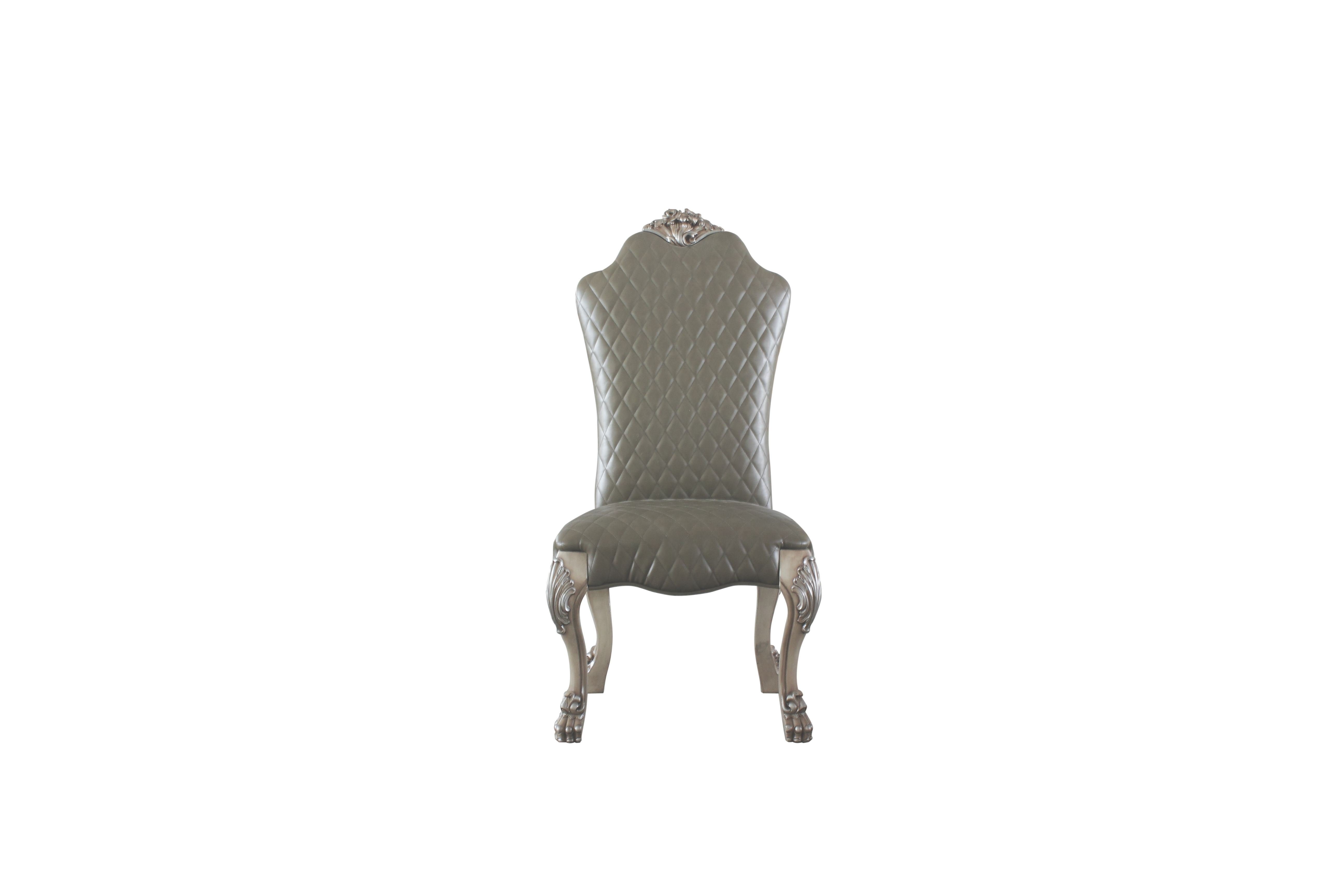 •KD, Armless Chair (High Backrest)• Stationary Seat: Standard Dining Height• Padded SEAT & BACK: PU Leather• Padded Scalloped Apron Seat (Diamond Pattern & Welt Trim)• Arched Backrest: Diamond Pattern Inside, Floral Crown & Nailhead Trim• Armless• Oversized Claw Leg with Raised Floral Motifs
