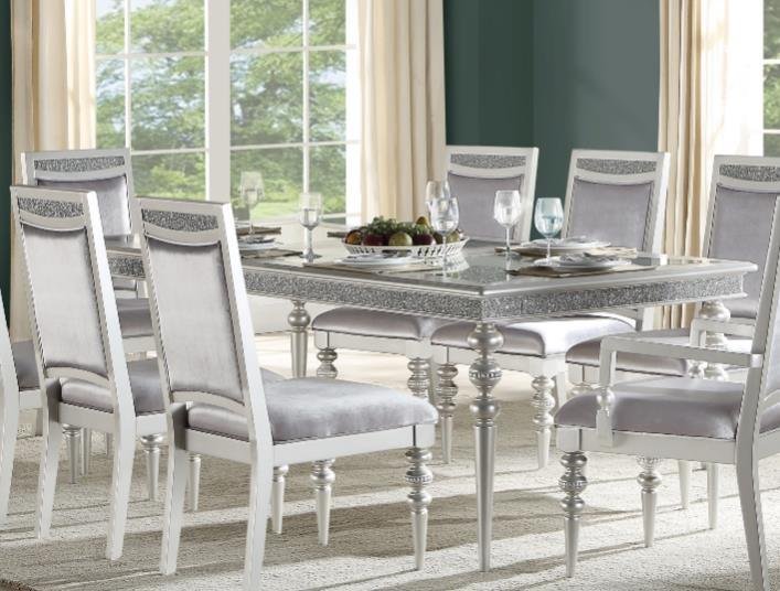 Make your dining room the centerpiece of your home with the Maverick dining set. This unique set comes in a platinum finish and sparkling rhinestone. The removable extension leaf which will create plenty of seating space and a welcoming place for all those who gather for a meal. Enhance your dining area with this stunning set.
