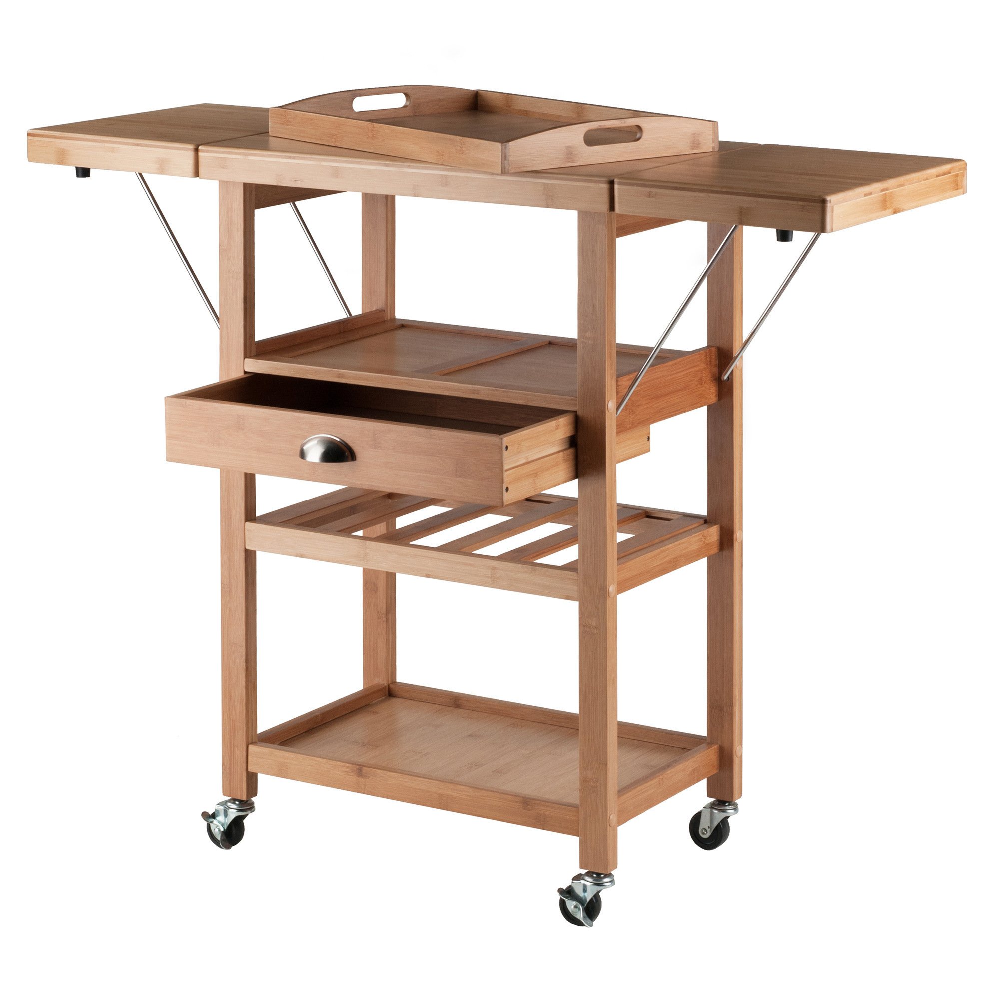 Everything you need to expand your kitchen; dining; or entertaining workspace is here in the Barton Kitchen Cart. Made of eco-friendly bamboo; this versatile space-saver has a wide range of uses. Two drop leaves expand the table top to create a large surface for chopping vegetables; tossing a salad; or for use as a serving area. Store wine bottles on the built-in wine rack and use the other shelves for glassware; dishes; and more. A unit-wide drawer and a removable serving tray complete this indispensable addition to your home.