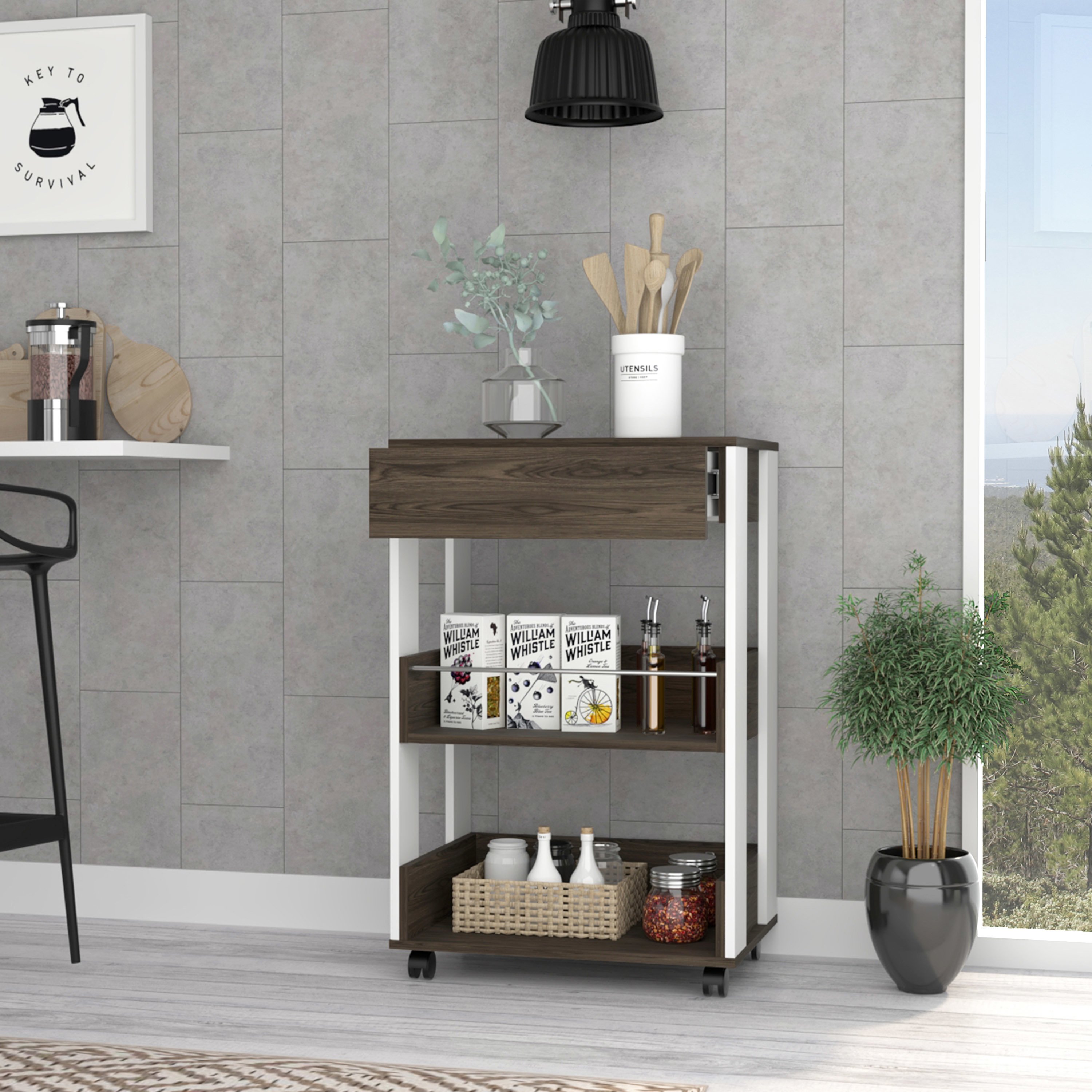 Dering 1-Drawer 2-Shelf Kitchen Cart with Caster White and Dark Walnut