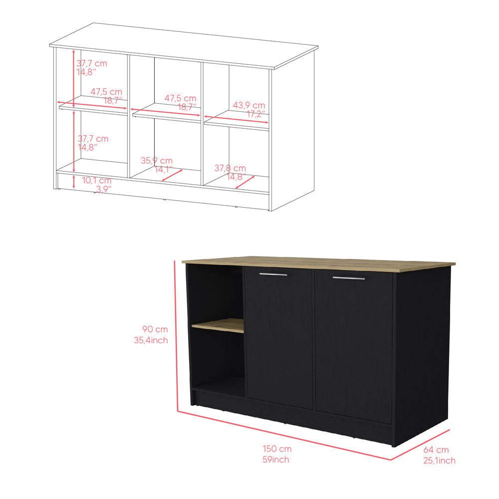 Meet the Kitchen Island Padua, where culinary finesse meets stylish functionality. Crafted with the modern chef in mind, it showcases a generous 59" W x 25.1" D countertop, making meal prepping a delight or even moonlighting as a chic dining table. Dual open storage shelves, each measuring 14.8"H x 17.2"W, keep ingredients or utensils within easy reach. Complementing this is a double-door cabinet, thoughtfully designed with inner shelves to tuck away cookware or groceries. All are elegantly framed in durable white/light oak, black/macadamia, black/onyx or white/onyx manufactured wood finishes.Dimensions:Height: 35,4" Width: 59'Depth: 25,1'Furniture Type: Ready to assemble (full assembly required).Certifications: CARB phase II compliant – TSCA Title VI Compliant.Warranty: 1-year warranty coverage in wooden parts- 1-year warranty coverage in hardware pieces since its manufacturing date found in the lot number printed in the product box.