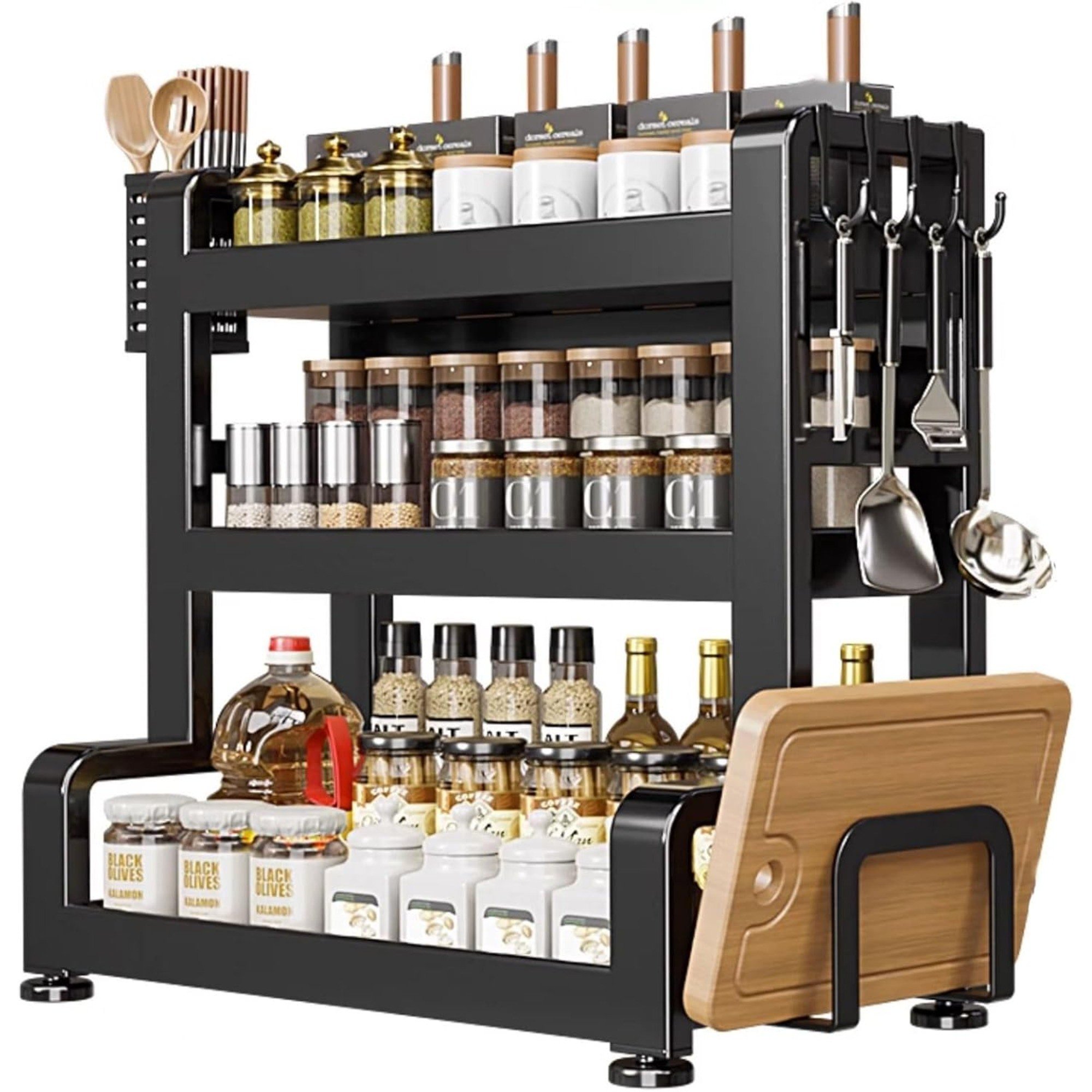 Kitchen Seasoning Rack, 3 Tier Tableware Holder for Countertops,Cutlery Organizer with Cutting Board & Lid Pot,Kitchen Storage Shelf with Hooks,Black Kitchen Seasoning Rack, 3 Tier Tableware Holder for Countertops,Cutlery Organizer with Cutting Board & Lid Pot,Kitchen Storage Shelf with Hooks,Black Kitchen Seasoning Rack, 3 Tier Tableware Holder for Countertops,Cutlery Organizer with Cutting Board & Lid Pot,Kitchen Storage Shelf with Hooks,Black