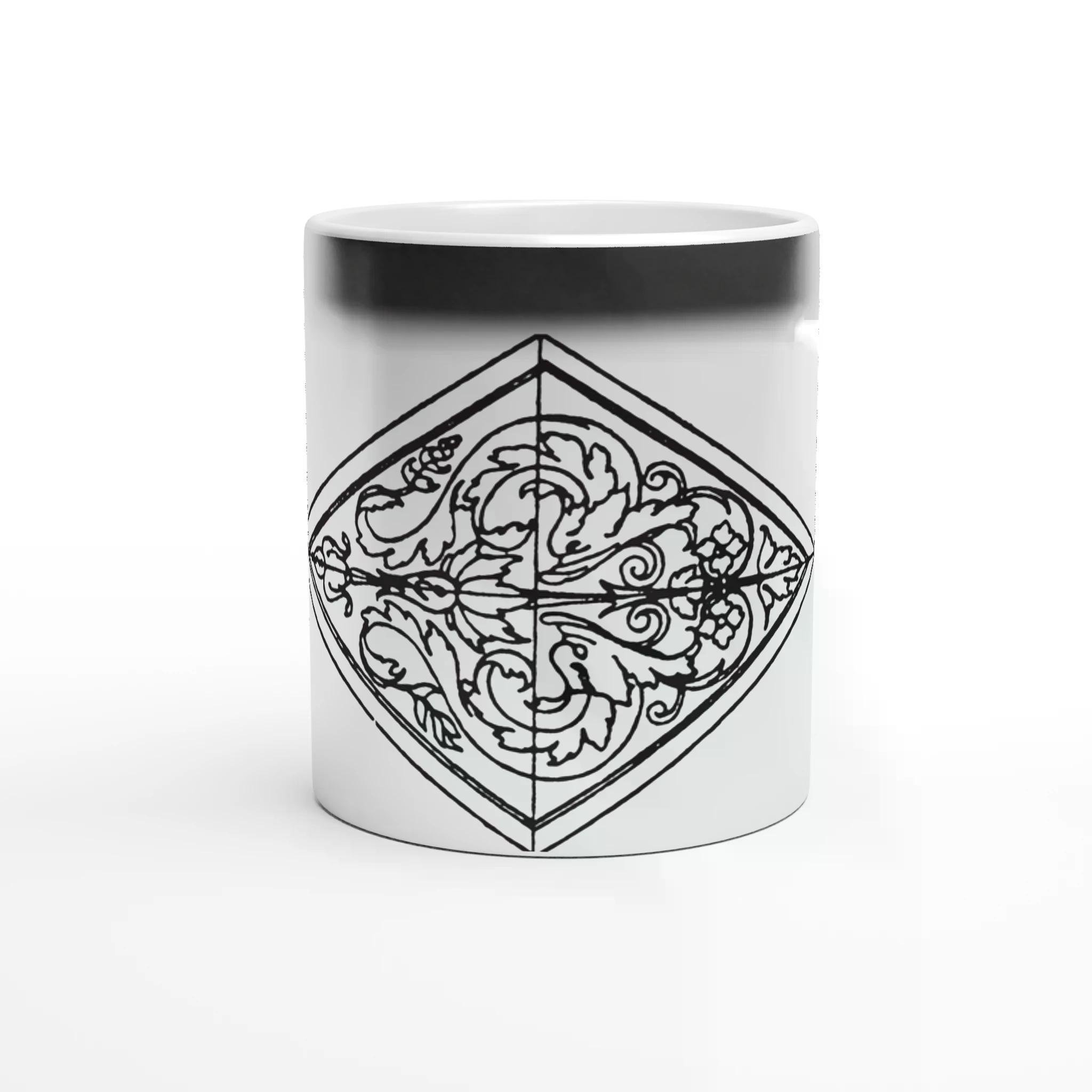 Unveil a hidden world with the Mystic Lozenge white Coffee Mugs This enchanting 11oz ceramic mug features a mesmerizing black and white lozenge design, expertly crafted by HadiArts. The intricate details and geometric patterns come to life when filled with a hot beverage, revealing a hidden masterpiece.