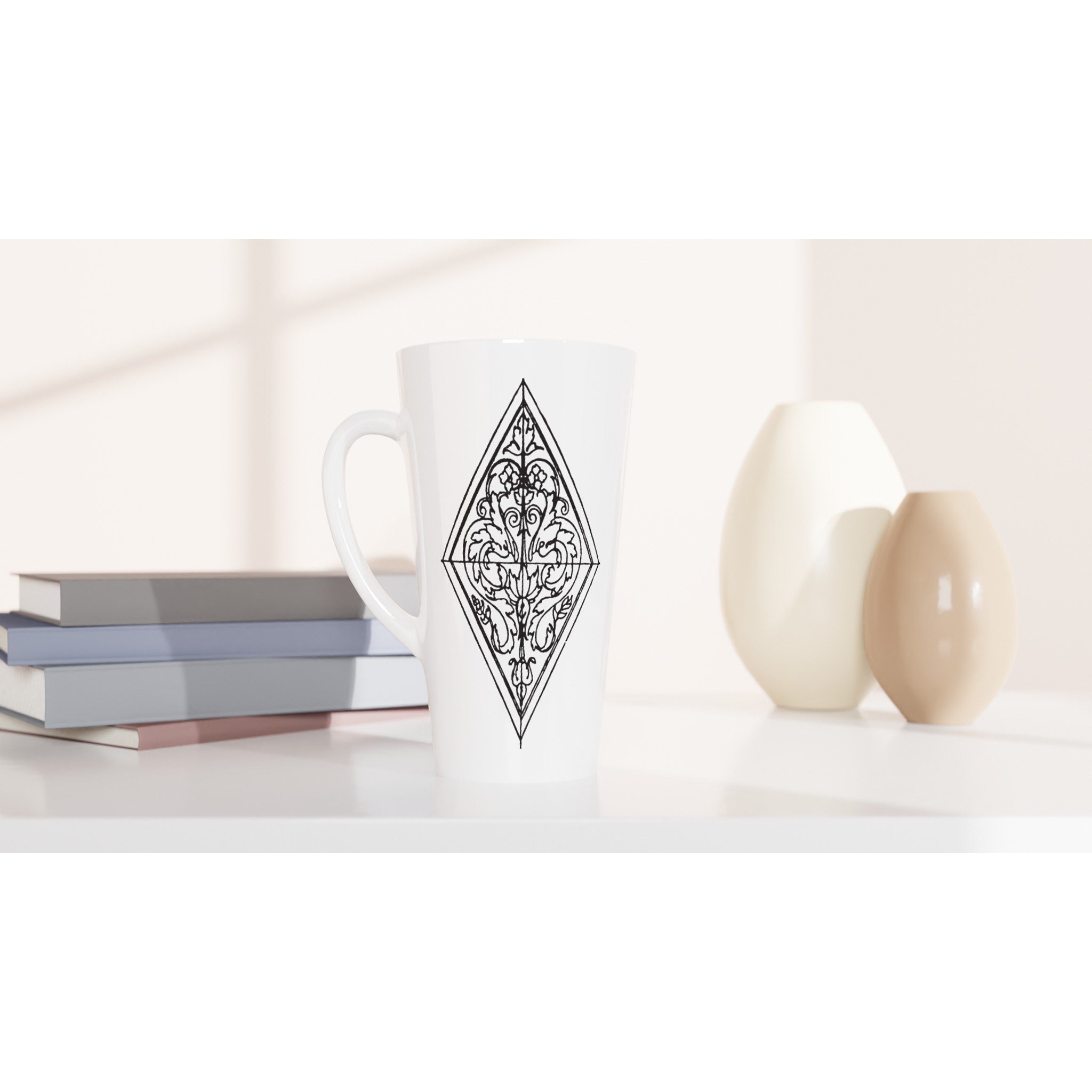 Embrace elegance with the Ornate Lozenge coffee Mugs. This 17oz latte ceramic coffee mugs features a captivating black and white lozenge design, expertly crafted by HadiArts. The intricate details and geometric patterns, inspired by vintage line drawings, add a touch of sophistication and artistry to your daily routine.