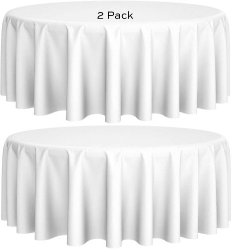 1.set of 2, eye-catching superior material: made of 100% polyester, which is easier to clean and durable than most cotton, providing more convenience for your using and cleaning. perfect size: 90 inch round tables. great for weddings, restaurants, food buffet, banquet, dinner. ingenious design: evenly stitch hemmed edges and seamless construction for an elegant look. if you find yourself using disposable tablecloths instead of fabric table cloths because you hate wrinkles and stains,