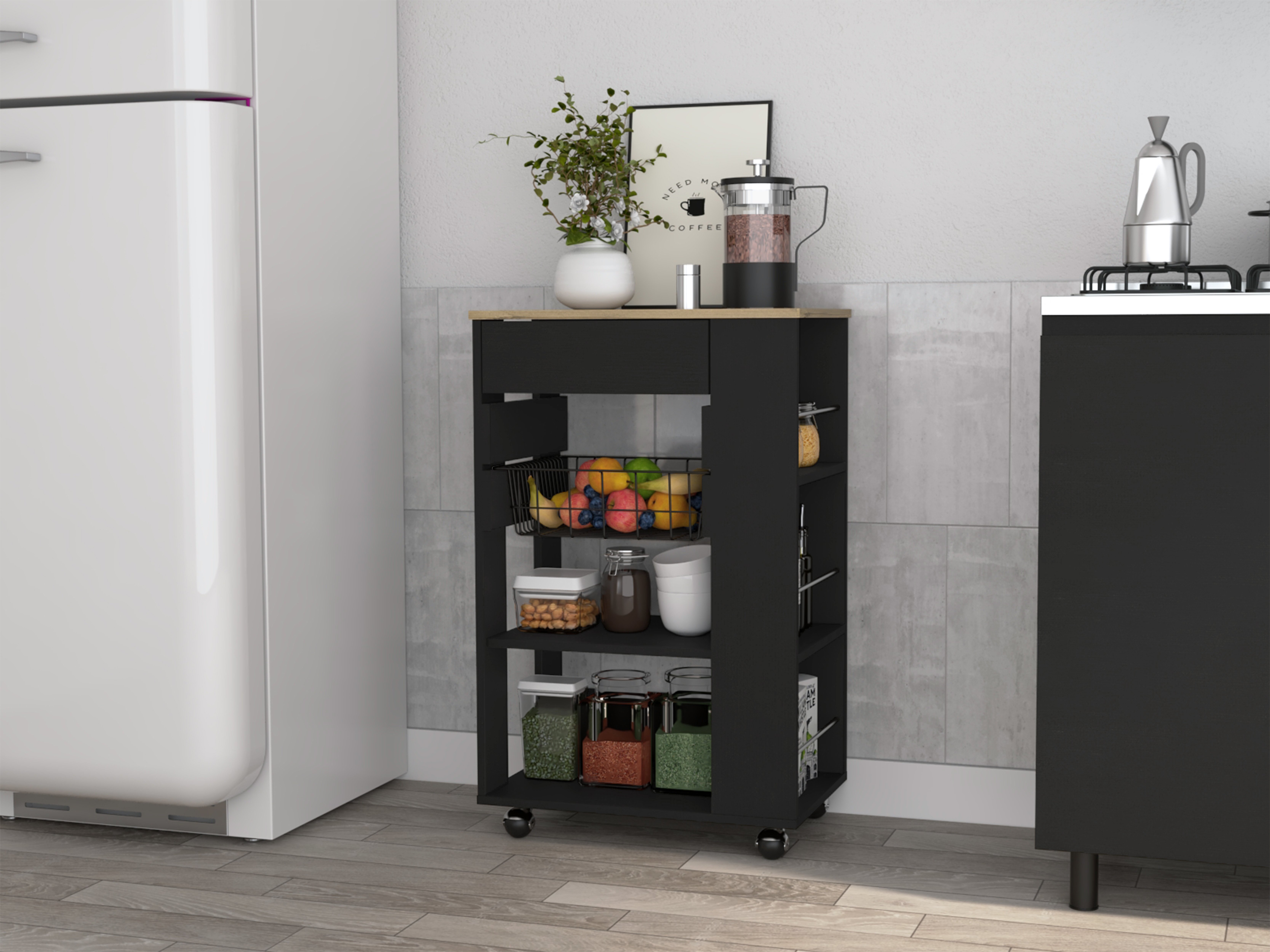 Set includesOne (1) kitchen cartDimensions35.4 inches high x 22.4 inches wide x 14.5 inches deepFinish ColorBlack Wengue and Light OakMaterialsManufactured woodNumber of drawers1Number of shelves6