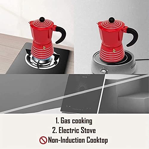 4.BREWING & WARNING: The delicate Stove Top Coffee Maker could be heated on Gas Stove/Alcohol/Camp/Ceramic/Electric Furnace under MEDIUM FIRE within 5 minutes. Please DO NOT USE Induction Cooker or brewing under FIERCE FLAMES might burn the handle and destroy the flavor.