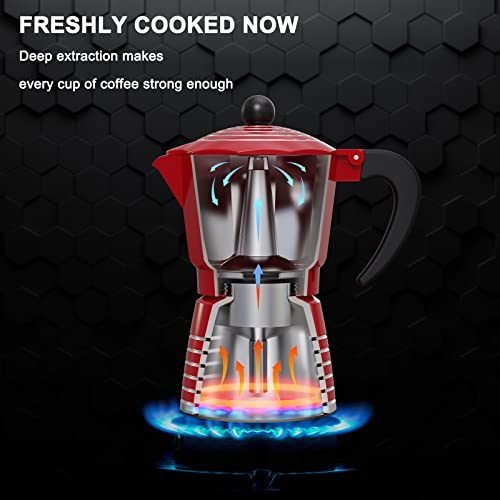 2.SAFE USE & EASY TO CLEAN: The 6 Cup Moka Pot applies PREMIUM FOOD GRADE ALUMINUM without risk of rust, scale or metal flakes from inferior Stainless Pots. Imported Italy Safe Valve effectively regulates the air pressure and prevents the spilling. Rinse the Stovetop Coffee Maker after usage, fully air and dry it. (NO WASHING LIQUID NEEDED & DISHWASHER BANNED).
