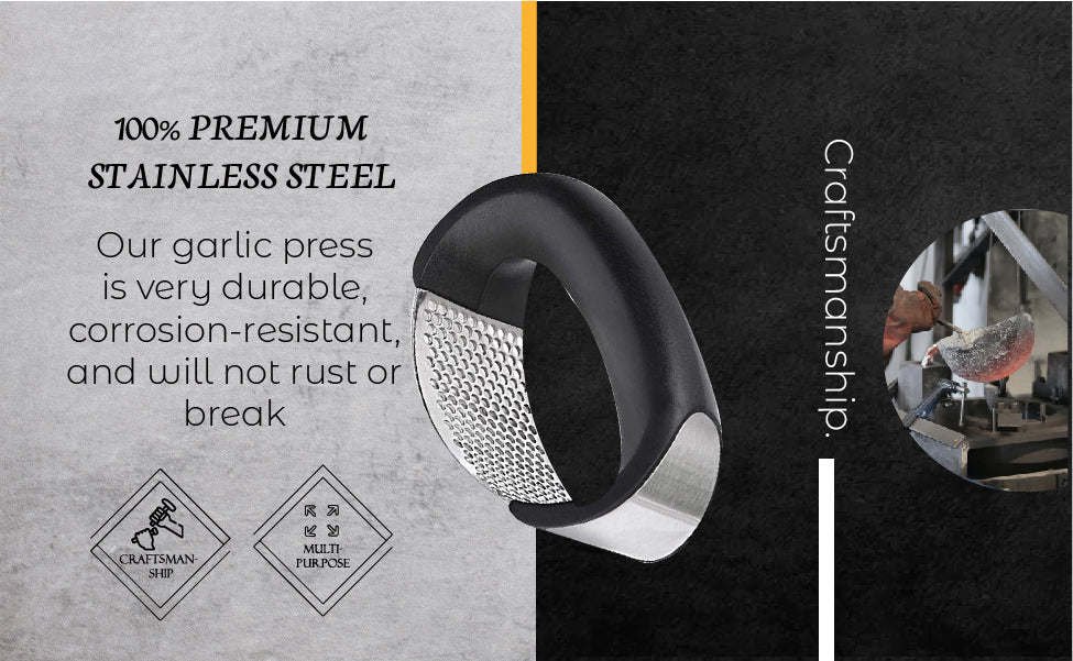 100% PREMIUM STAINLESS STEEL. Our garlic press is very durable; corrosion-resistant; and will not rust or break.