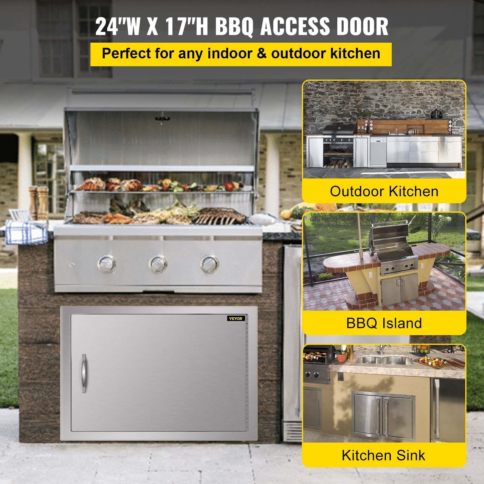 Our 24" x 17"/61 x 43 cm outdoor kitchen door is made of stainless steel, rust- and corrosion-proof for a long service time. The seamless design blocks dust/rainwater and round corners ensure secure use.